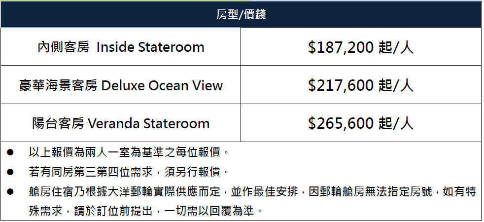 5. 以上行程之訂位以上行程之訂位及及取消條款取消條款,皆依照,皆依照郵輪郵輪公司公司之規定之規定;委託;委託交易前,請務必充份瞭解相關內容。交易前,請務必充份瞭解相關內容。郵輪公司公司保留一切最終決定權。保留一切最終決定權。