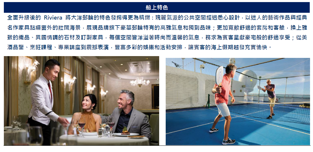 豪華郵輪上有各式各樣為您精心設計的活動,歡迎貴賓們來加入,或是您可盡情的享受船上的設備,如:游泳池、健身房..等,是您絕佳的選擇,極目之處盡是藍天白雲及無垠大海,何不把握郵輪上的美好時光,輕鬆愉快的品嚐美酒佳餚,郵輪上為您精心安排的精彩節目正在上演,絕對讓您不虛此行!