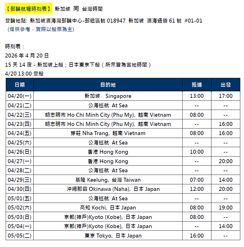 | DAY 10 | 基隆港 | 07:00 | 14:00 |