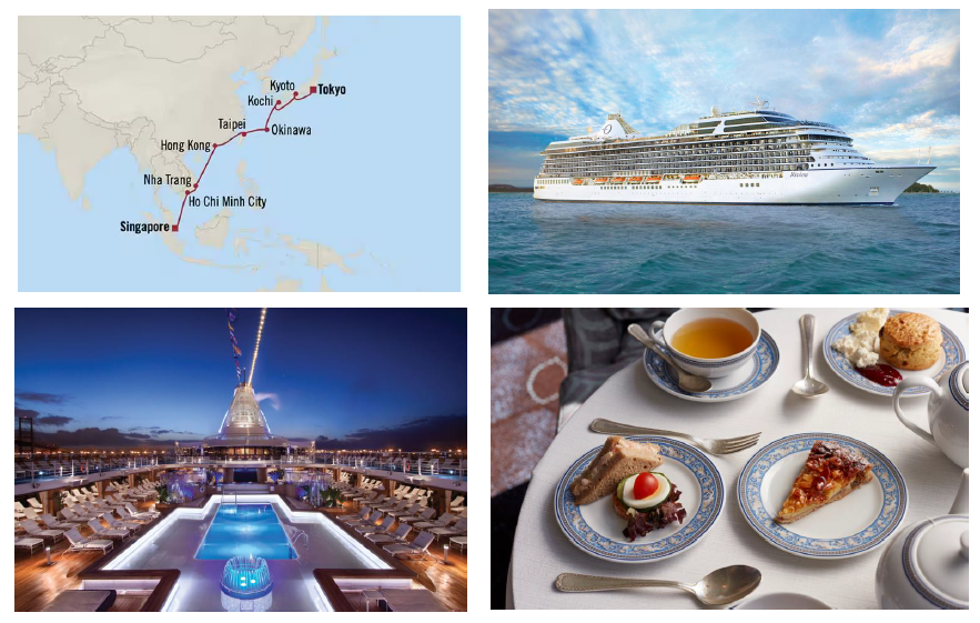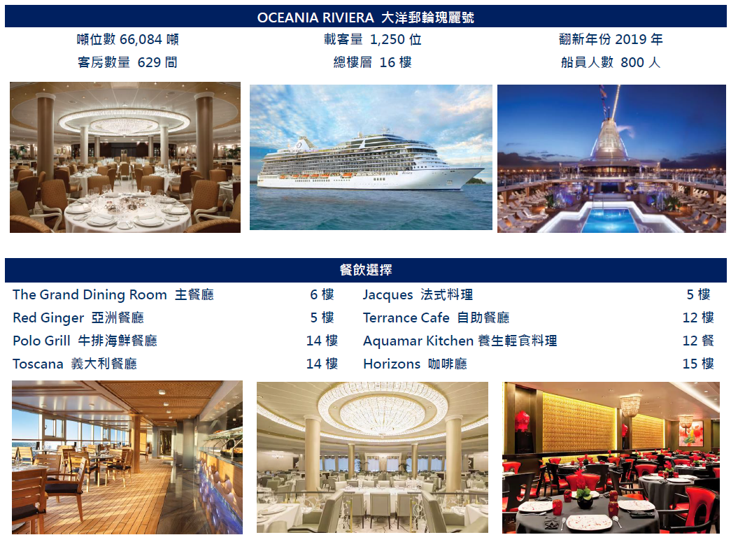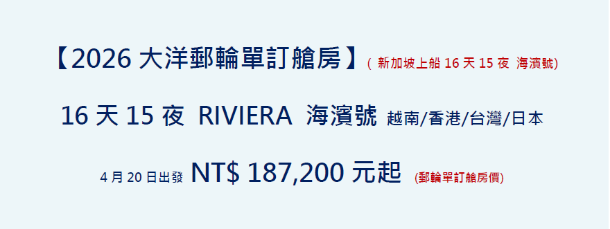 前往新加坡郵輪碼頭辦理報到手續,完成報到手續後即可登上譽有”海上米其林”之稱的大洋郵輪--精緻奢華的五星級船隊,旗下的RIVIERA海濱號,巡遊亞洲的夢幻航程即將展開。