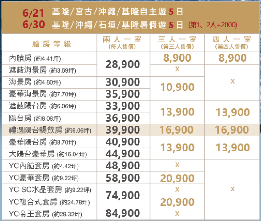 2026/06/21 出發NT28,900元起(全程郵輪住宿/含稅價)