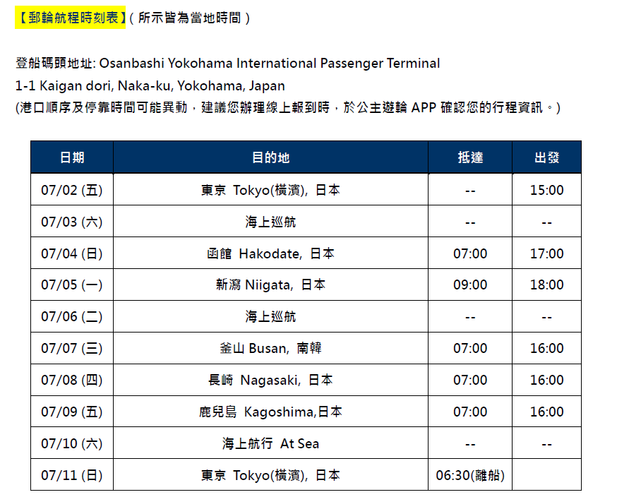 | 航程日 | 停泊港口 | 抵達時間 | 出發時間 |