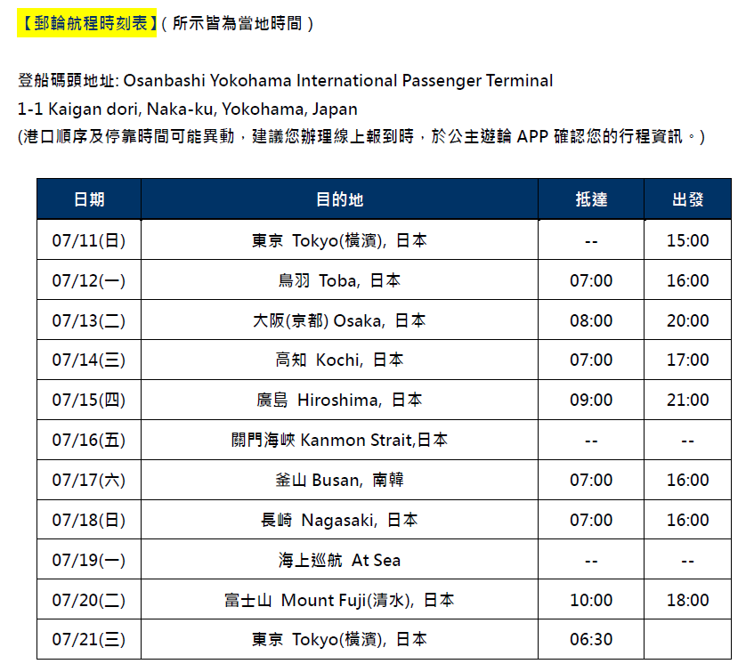 | 航程日 | 停泊港口 | 抵達時間 | 出發時間 |