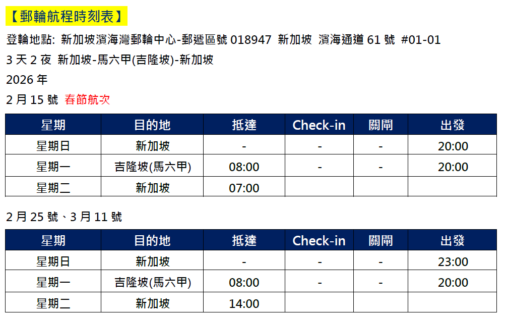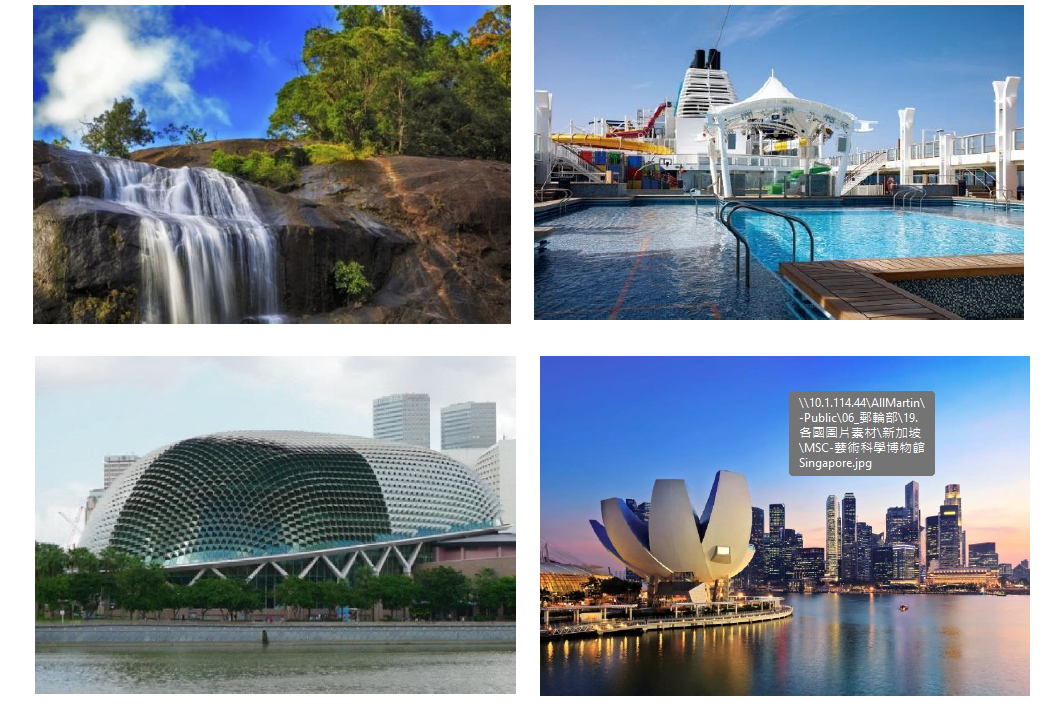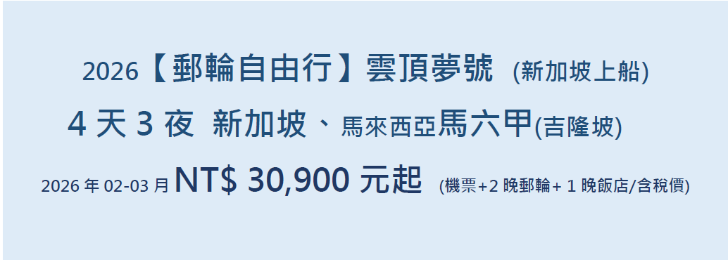 年年都會推陳出新設施的新加坡,致力於觀光發展,已從花園城市蛻變成更具魅力的全方位城市。想要深度體驗新加坡之美,不妨以美食、景點、玩樂、住宿、購物再出發,這些不同角度都能讓首訪或再訪的遊客對新加坡有驚豔的幸福感。通關後,安排接送前往新加坡濱海灣郵輪中心,準備報到事宜。