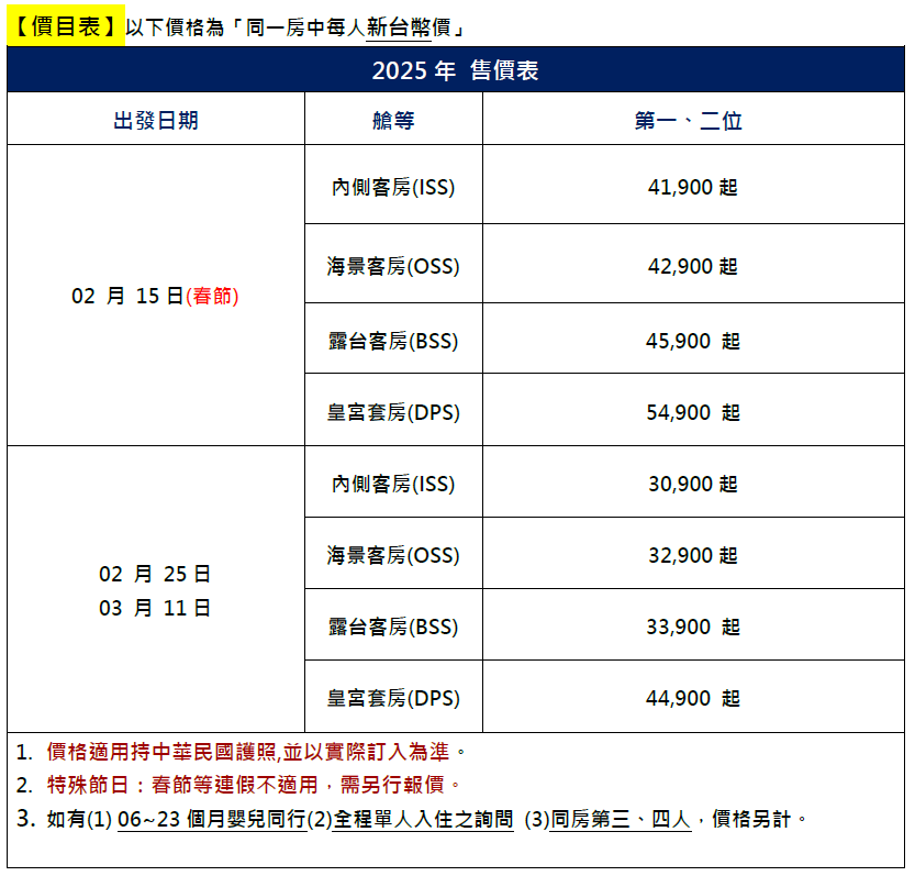 *同一房中任一人取消,除收取必要之取消費外,如因此取消而產生單人住宿時,需再補足所訂艙房費用50% 的單人住宿價差。