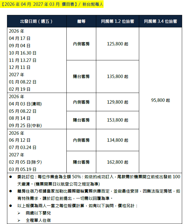 週五出發 NT$125,800 元起 (來回機票+郵輪住宿)