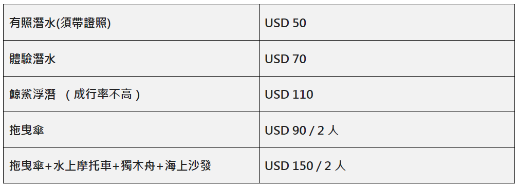 | 12月 | 天氣晴朗,溫暖乾燥 | 旺季,高峰期 | 浮潛、潛水、海灘活動 |