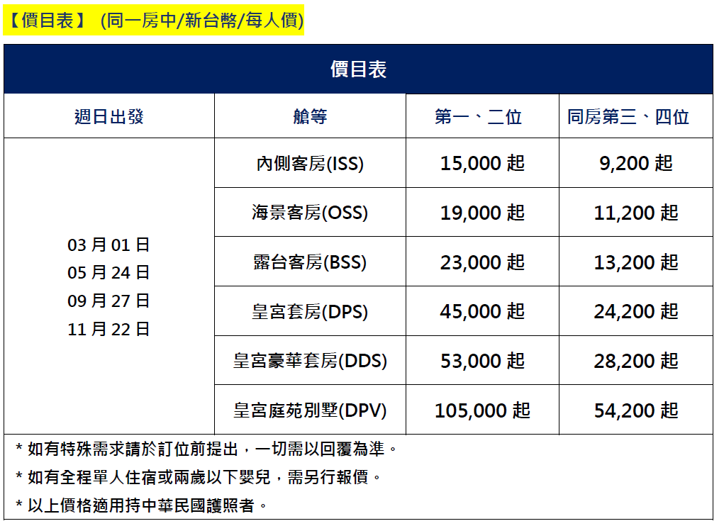 ※ 如因個人因素取消艙房預定,除原應收之艙房取消費用外。旅客另須支付『旅行社郵輪作業行政處理費』,每位新台幣600元。