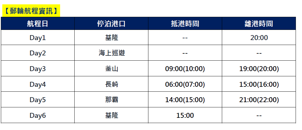 | DAY 1 | 基隆港 | - | 20:00 |