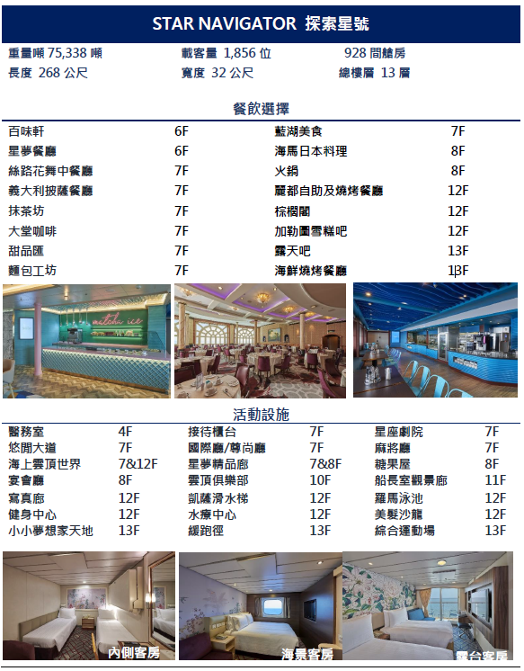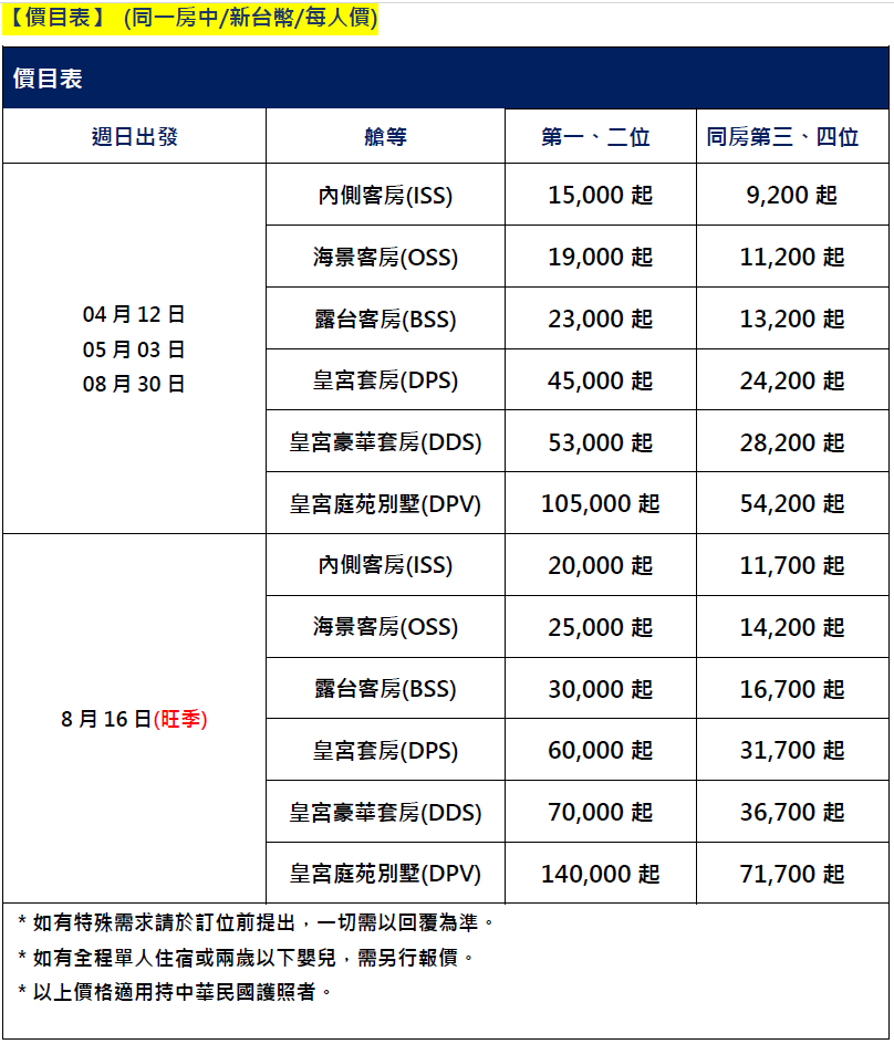 ※ 如因個人因素取消艙房預定,除原應收之艙房取消費用外。旅客另須支付『旅行社郵輪作業行政處理費』,每位新台幣600元。