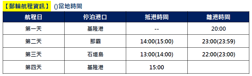 | DAY 1 | 基隆港 | - | 20:00 |