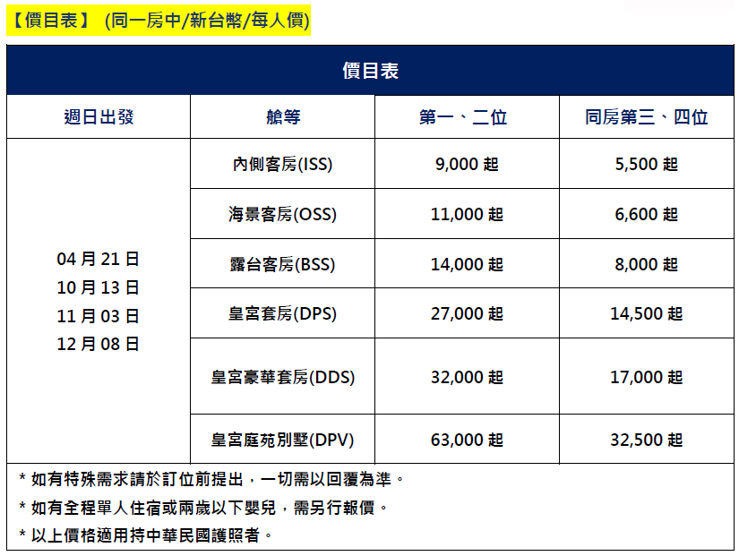 2026年 04-12月 週二出發 NT$ 9,000元起 (3晚郵輪/含稅價)
