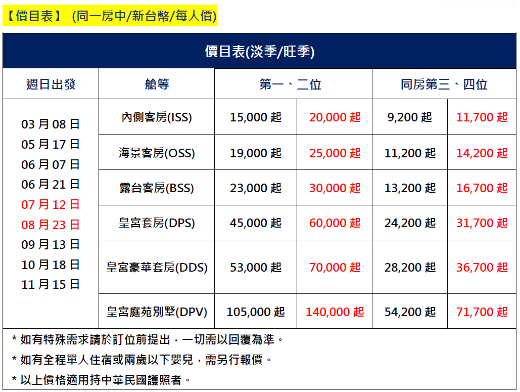 ※ 如因個人因素取消艙房預定,除原應收之艙房取消費用外。旅客另須支付『旅行社郵輪作業行政處理費』,每位新台幣600元。