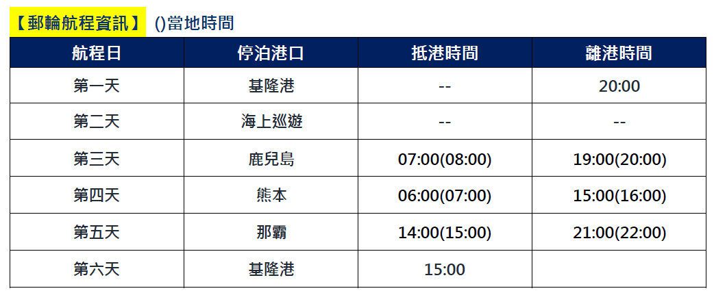 | DAY 3 | 鹿兒島 | 07:00 | 19:00 |