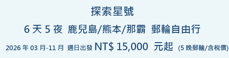 週日出發 NT$ 15,000元起 **早鳥優惠數量有限,售完為止**