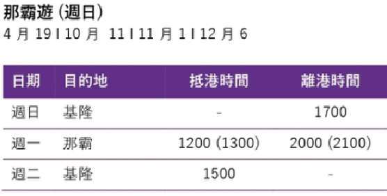 | 航程日 | 停泊港口 | 抵達時間 | 出發時間 |