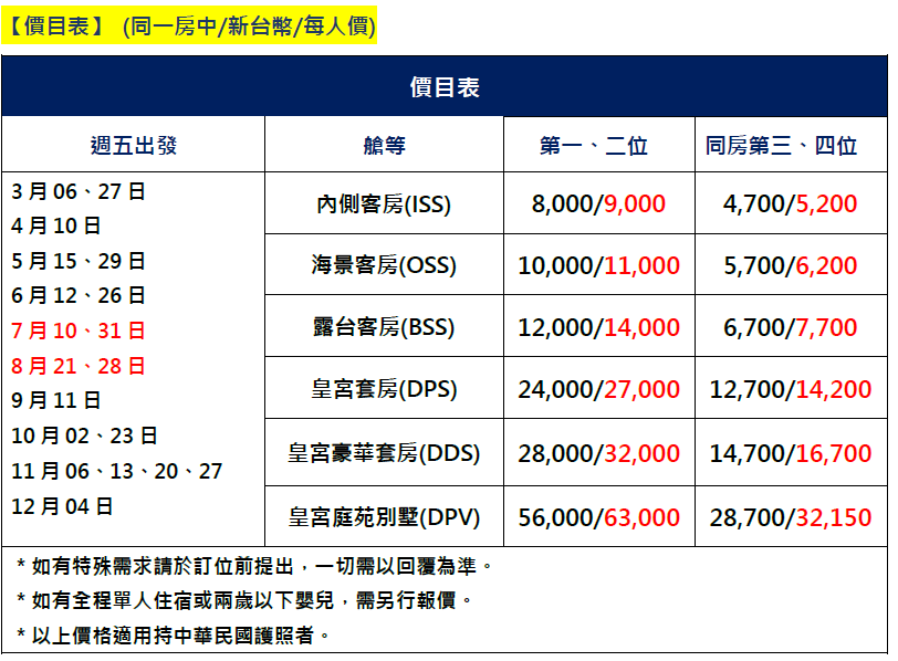 2026年03月-12月 週五出發NT$ 8,000元起 (2晚郵輪/含稅價)