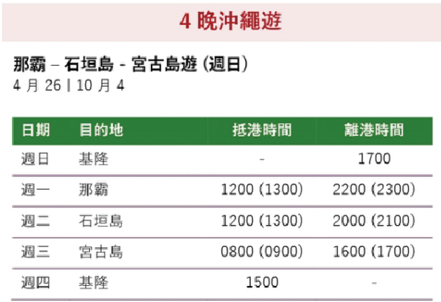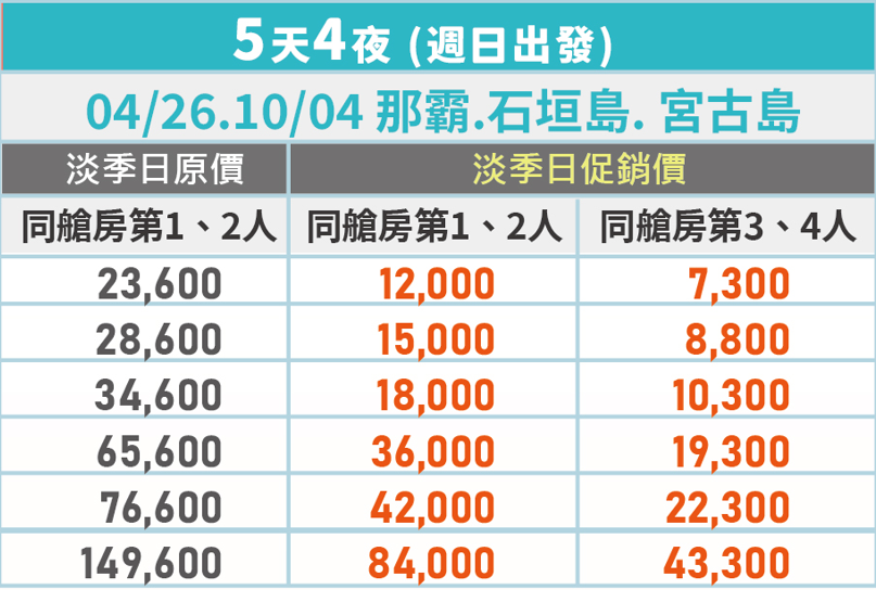 2026年 04-10月 週日出發 NT$ 12,000元起 (4晚郵輪/含稅價)