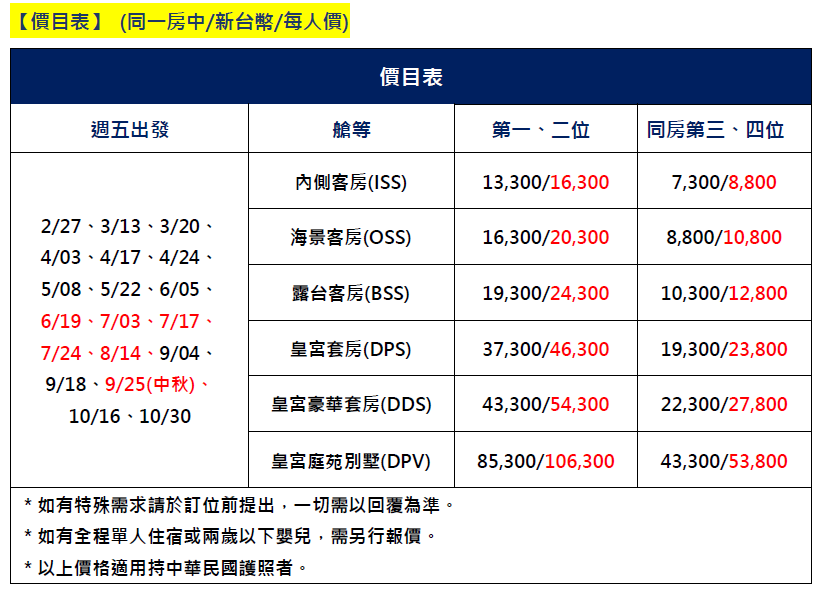 ※ 如因個人因素取消艙房預定,除原應收之艙房取消費用外。旅客另須支付『旅行社郵輪作業行政處理費』,每位新台幣600元。