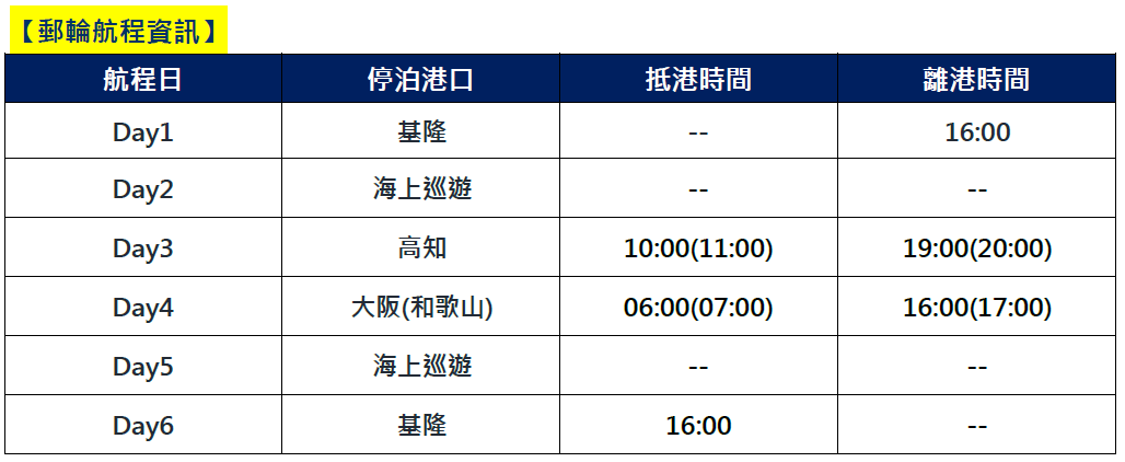 | 航程日 | 停泊港口 | 抵達時間 | 出發時間 |