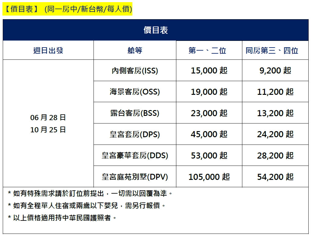 ※ 如因個人因素取消艙房預定,除原應收之艙房取消費用外。旅客另須支付『旅行社郵輪作業行政處理費』,每位新台幣600元。