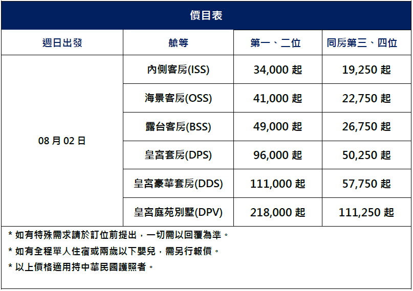 ※ 如因個人因素取消艙房預定,除原應收之艙房取消費用外。旅客另須支付『旅行社郵輪作業行政處理費』,每位新台幣600元。