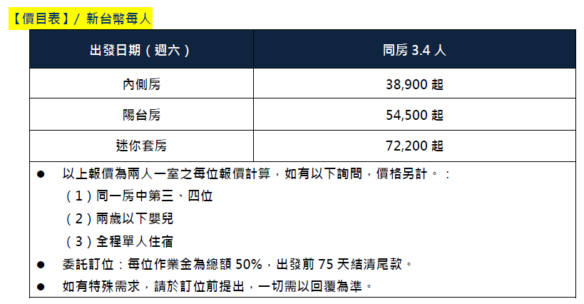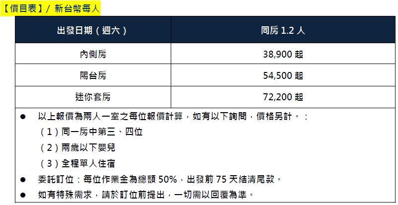 2026年05月23日 週六出發NT$ 38,900元起 (7晚郵輪/含稅價)
